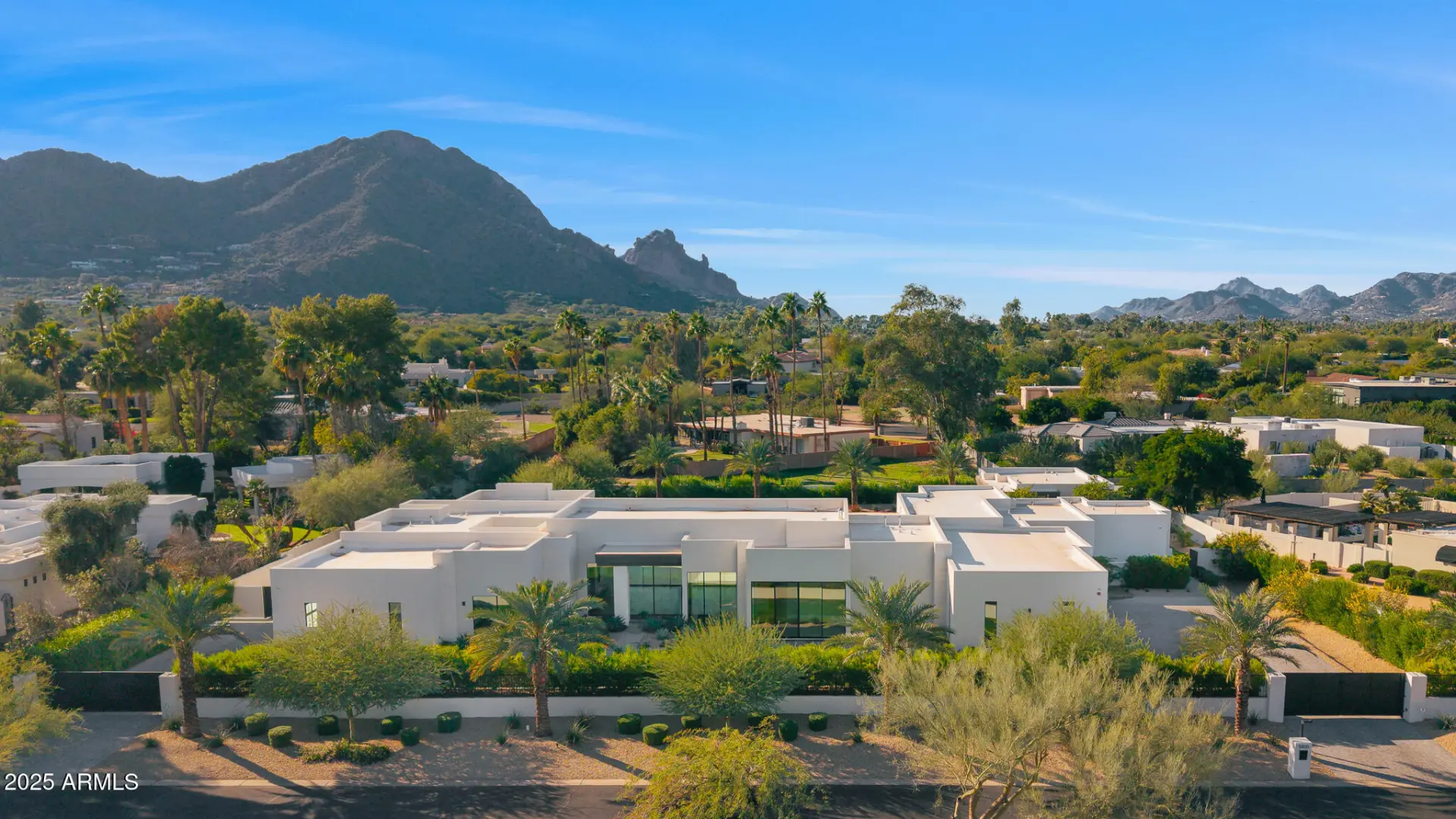 With its modern architecture, striking curb appeal, and sweeping Camelback Mtn views, this gated home with full guest house is truly the one you've been waiting for. This private estate offers 5 bedrooms, 7 bathrooms, a 6+ car garage, dedicated office, and a home gym, all wrapped in chic design and serene living spaces. The primary retreat is an inviting sanctuary, featuring telescoping doors, a cozy fireplace, and a convenient coffee station. The luxurious primary bath includes an impressive walk-in closet with double islands, a washer and dryer, dual vanities with a makeup area, a soaking tub, a walk-in shower, and even a privately enclosed outdoor shower. The guest wing includes its own secondary family room, a theater with projection screen, and three en-suite guest bedrooms.